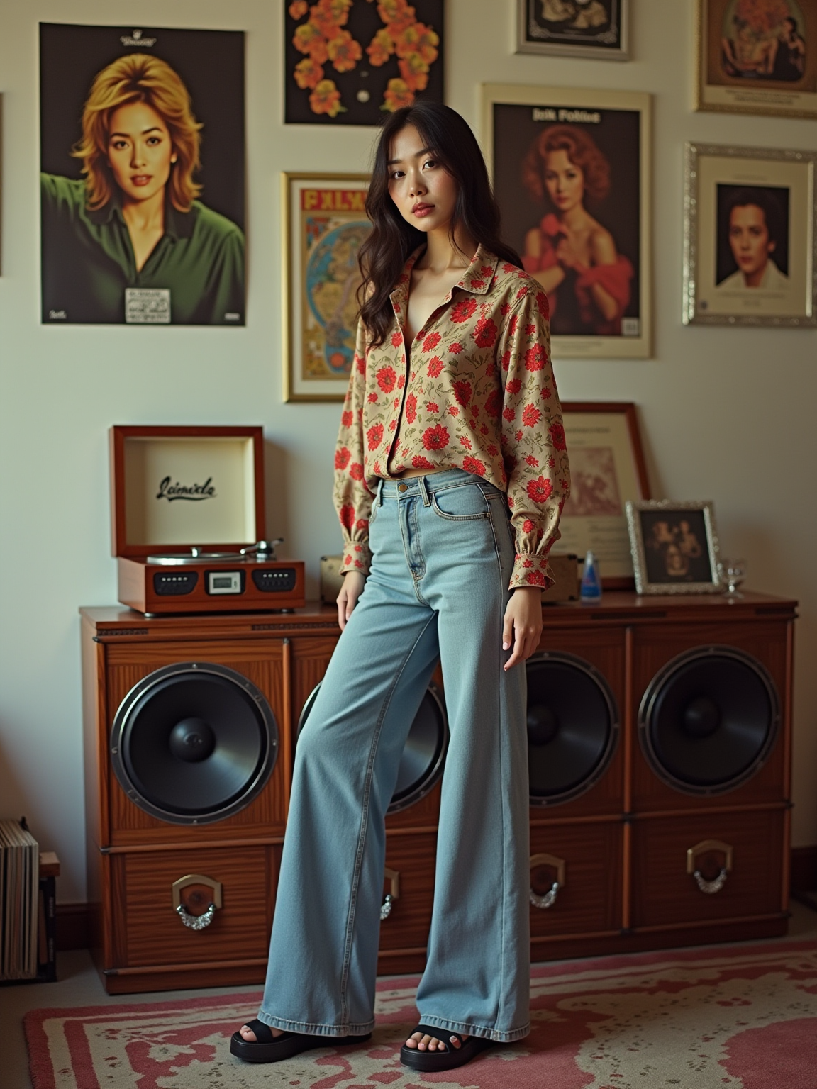 model in a typical 70s bedroom, wearing a peasant blouse with wide-leg jeans and platform shoes , surrounded by scattered vinyl records and 8-track tapes, posters of 70s rock bands and disco stars on the walls, wood-grain stereo system with turntable in background