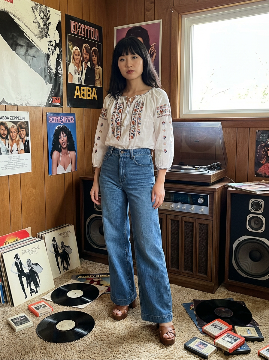 model in a typical 70s bedroom, wearing a peasant blouse with wide-leg jeans and platform shoes , surrounded by scattered vinyl records and 8-track tapes, posters of 70s rock bands and disco stars on the walls, wood-grain stereo system with turntable in background