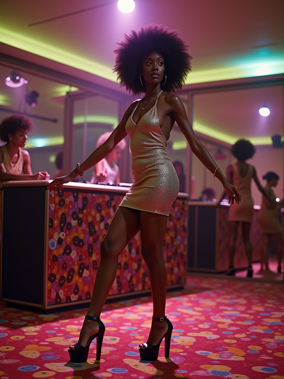 model in a typical 70s disco, wearing a metallic halter dress with platform heels , dancing under a spinning disco ball, neon lights reflecting off mirrored walls, vinyl records scattered around DJ booth, psychedelic carpet with wild patterns