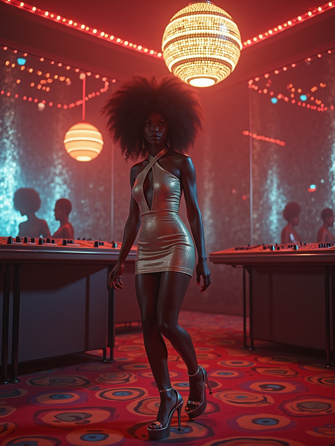 model in a typical 70s disco, wearing a metallic halter dress with platform heels , dancing under a spinning disco ball, neon lights reflecting off mirrored walls, vinyl records scattered around DJ booth, psychedelic carpet with wild patterns