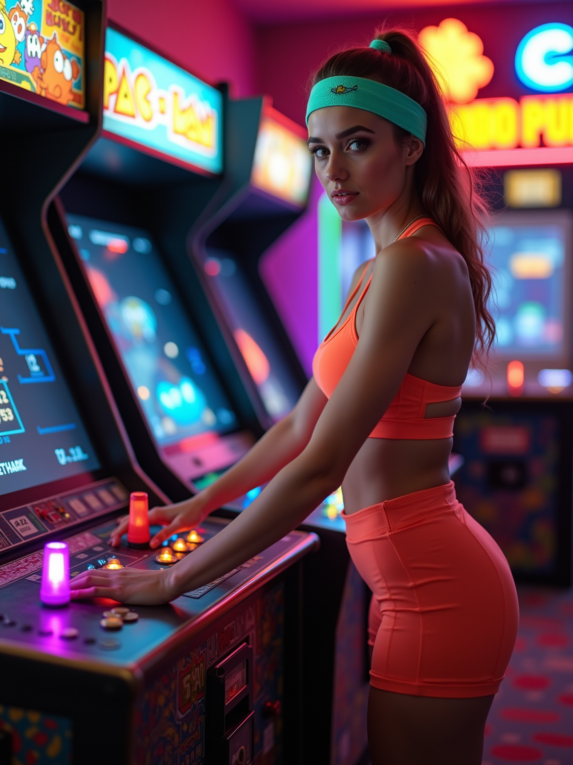 model in a typical 80s arcade, wearing neon workout gear with sweatbands , playing Pac-model or Donkey Kong, neon lights reflecting off arcade cabinets, quarters scattered on machine, retro carpet with wild patterns