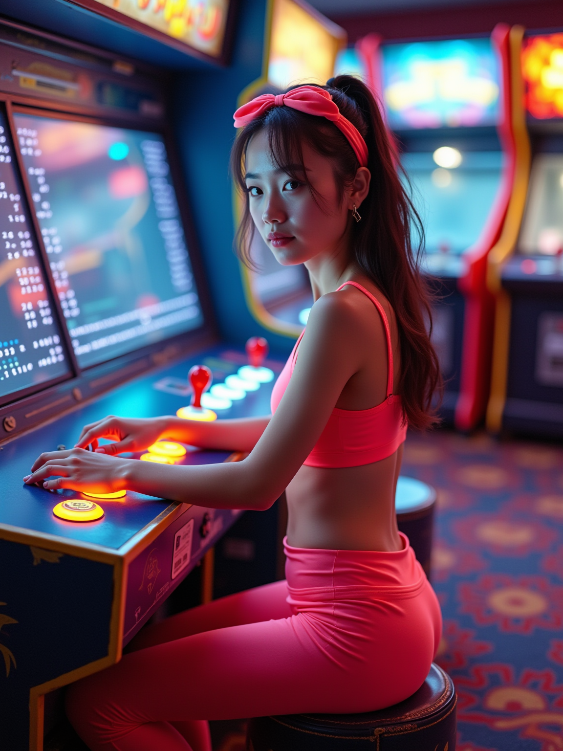 model in a typical 80s arcade, wearing neon workout gear with sweatbands , playing Pac-model or Donkey Kong, neon lights reflecting off arcade cabinets, quarters scattered on machine, retro carpet with wild patterns