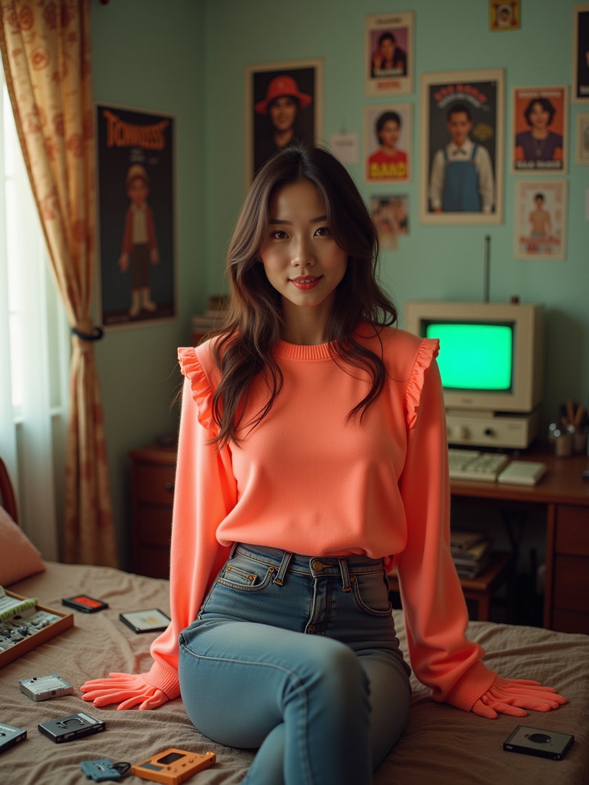 model in a typical 80s bedroom, wearing a bright neon sweater with shoulder pads and leg warmers with high-waisted jeans , surrounded by scattered cassette tapes and vinyl records, posters of 80s bands and movies on the walls, retro computer with green monochrome monitor in background