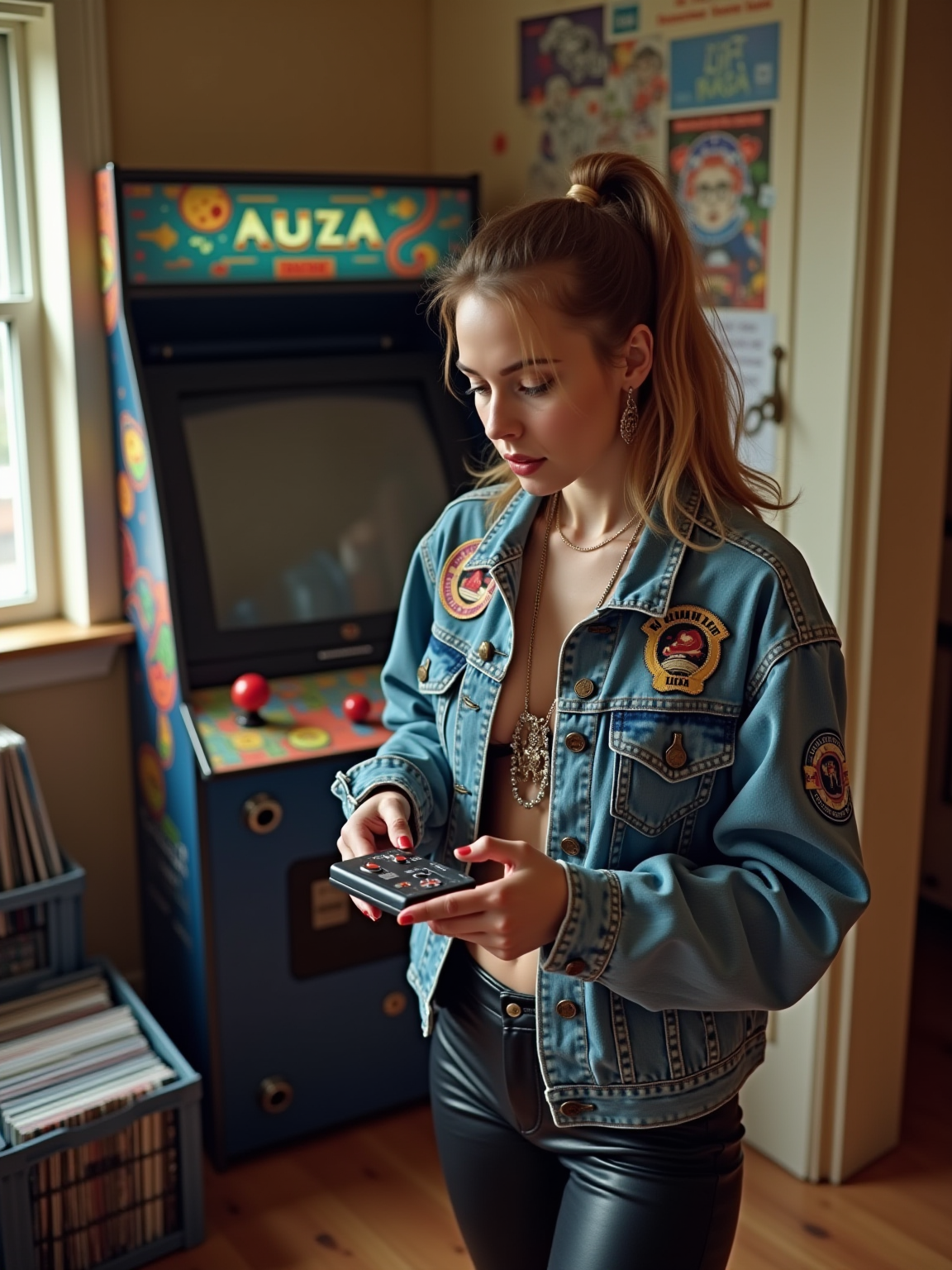 model in a typical 90s rec room, wearing a denim jacket covered in patches with leather pants , playing with a Game Boy, boom box playing in background, milk crate full of vinyl records and CDs, retro arcade cabinet visible