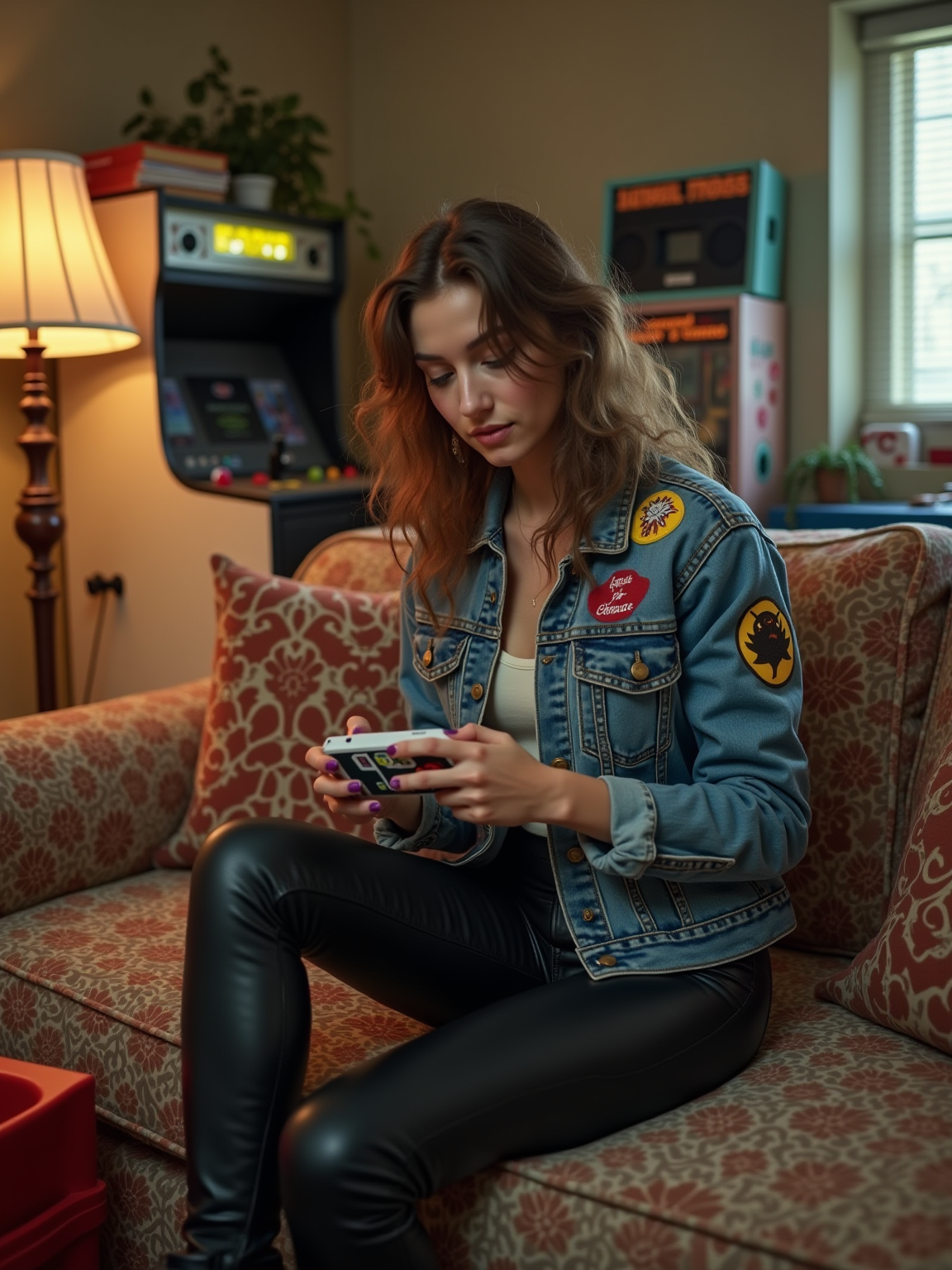 model in a typical 90s rec room, wearing a denim jacket covered in patches with leather pants , playing with a Game Boy, boom box playing in background, milk crate full of vinyl records and CDs, retro arcade cabinet visible