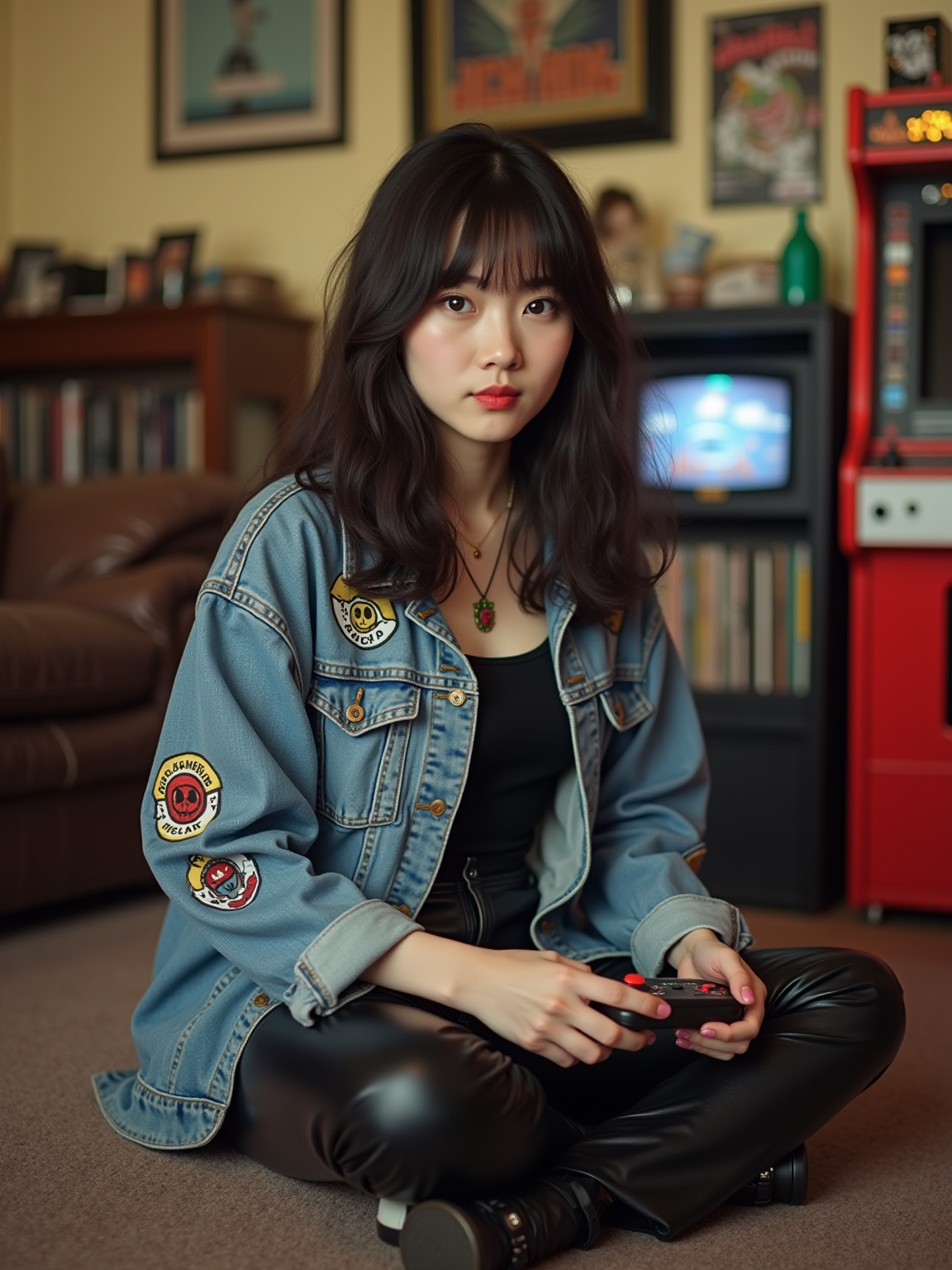 model in a typical 90s rec room, wearing a denim jacket covered in patches with leather pants , playing with a Game Boy, boom box playing in background, milk crate full of vinyl records and CDs, retro arcade cabinet visible