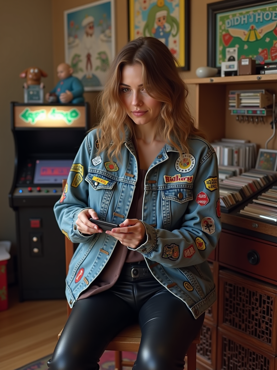 model in a typical 90s rec room, wearing a denim jacket covered in patches with leather pants , playing with a Game Boy, boom box playing in background, milk crate full of vinyl records and CDs, retro arcade cabinet visible
