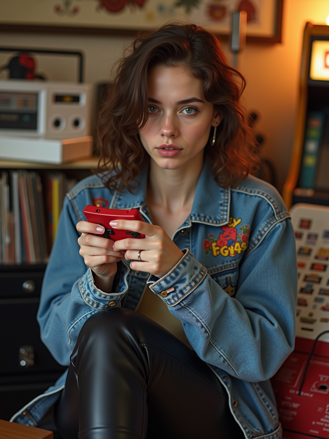 model in a typical 90s rec room, wearing a denim jacket covered in patches with leather pants , playing with a Game Boy, boom box playing in background, milk crate full of vinyl records and CDs, retro arcade cabinet visible
