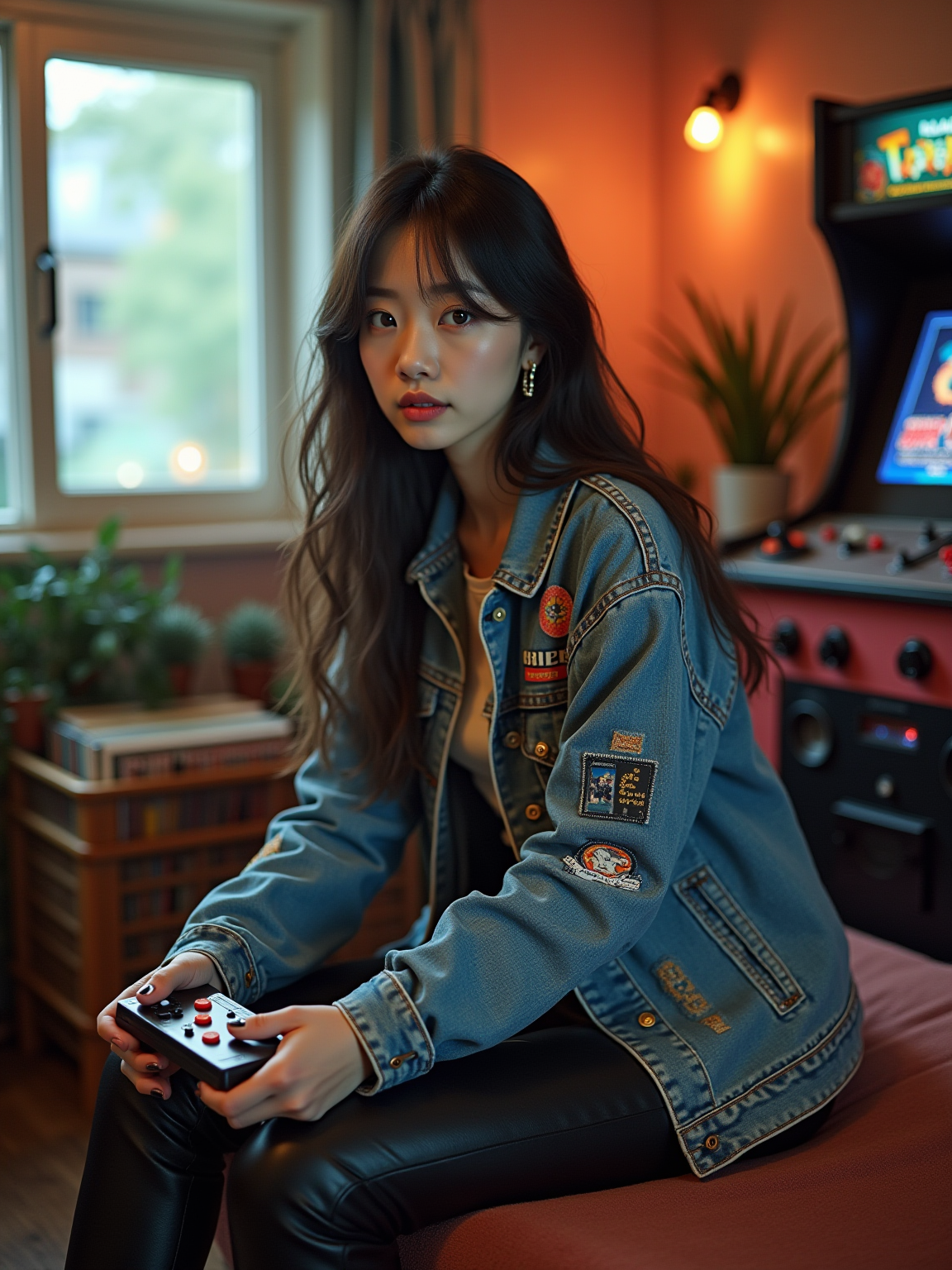 model in a typical 90s rec room, wearing a denim jacket covered in patches with leather pants , playing with a Game Boy, boom box playing in background, milk crate full of vinyl records and CDs, retro arcade cabinet visible