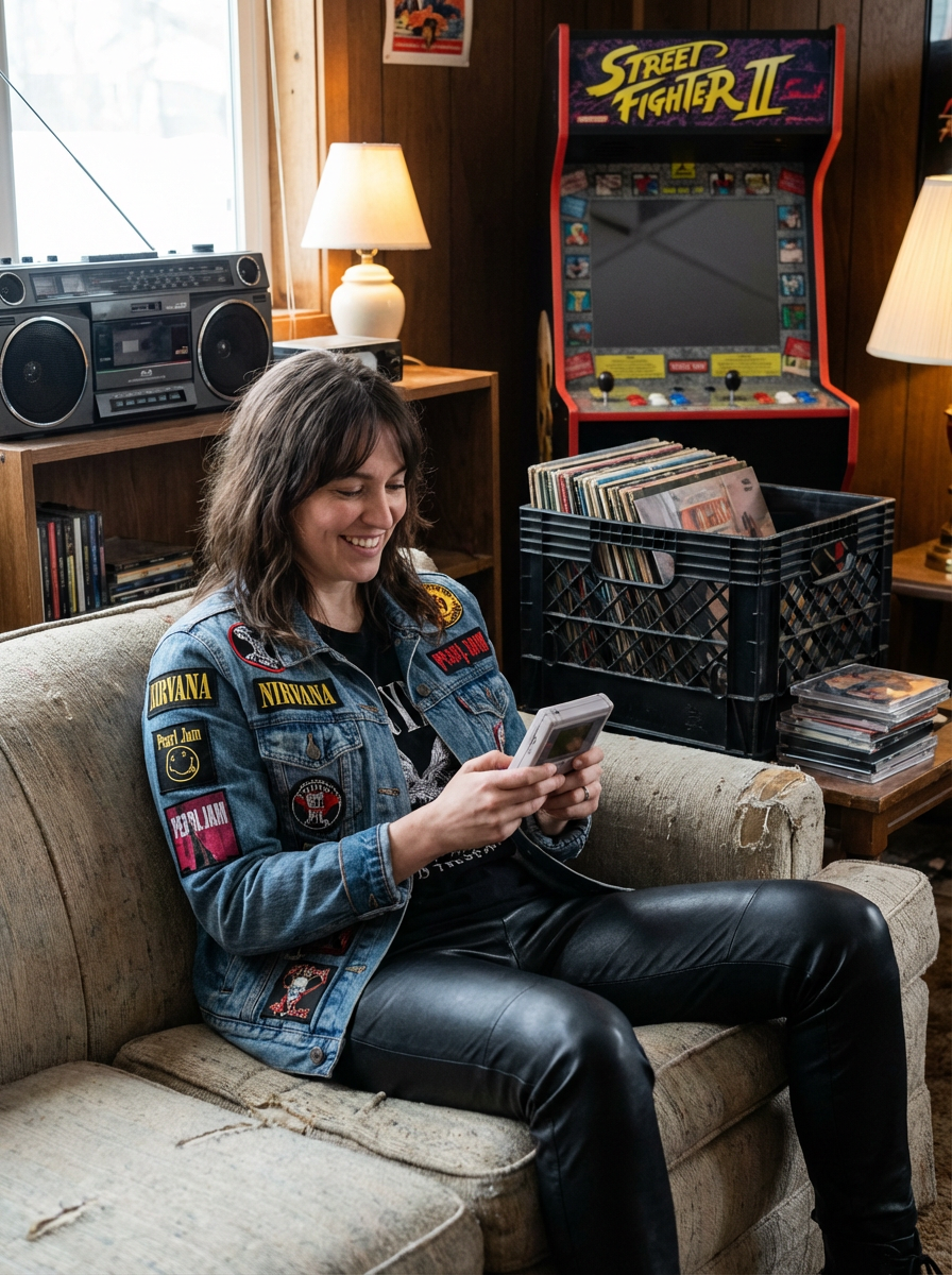 model in a typical 90s rec room, wearing a denim jacket covered in patches with leather pants , playing with a Game Boy, boom box playing in background, milk crate full of vinyl records and CDs, retro arcade cabinet visible