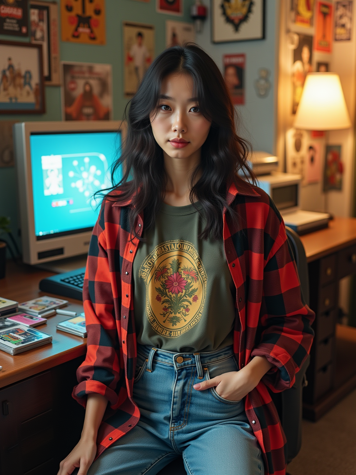 model in a typical 90s teenage bedroom, wearing a colorful oversized flannel shirt over a band t-shirt with high-waisted jeans , surrounded by scattered cassette tapes and CD cases, posters of 90s bands on the walls, retro computer with CRT monitor in background