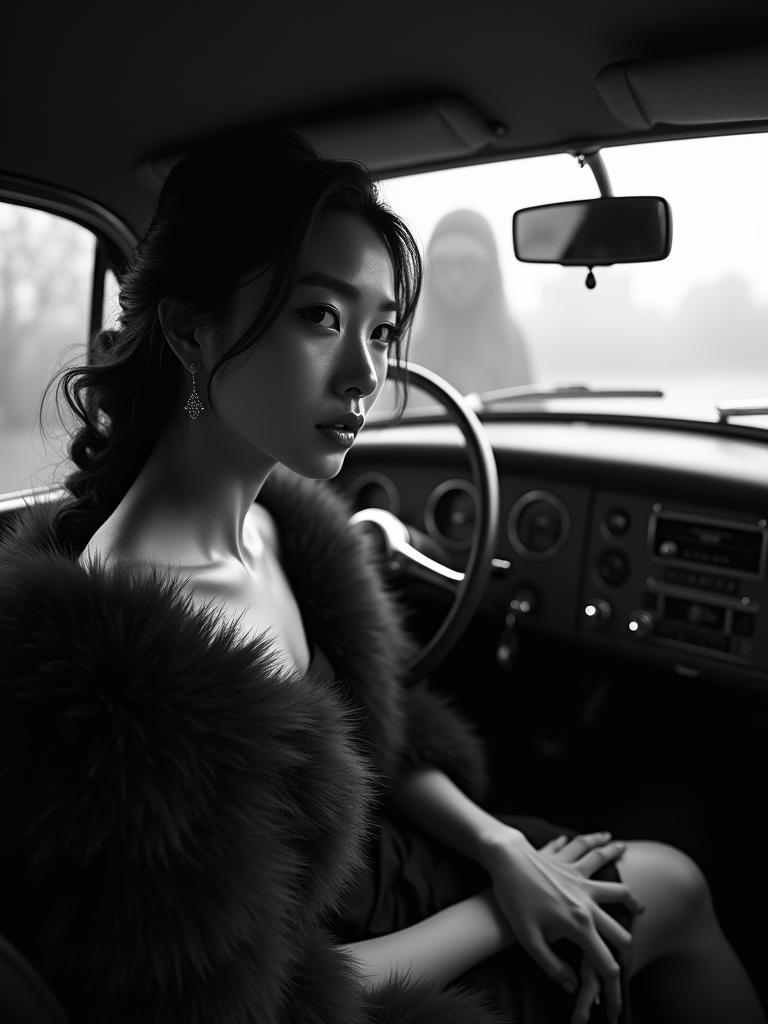 model in a vintage car interior, wearing a fur stole over an evening dress , dramatic lighting through car windows creating venetian blind effect, rear-view mirror showing mysterious figure, high-contrast black and white photography