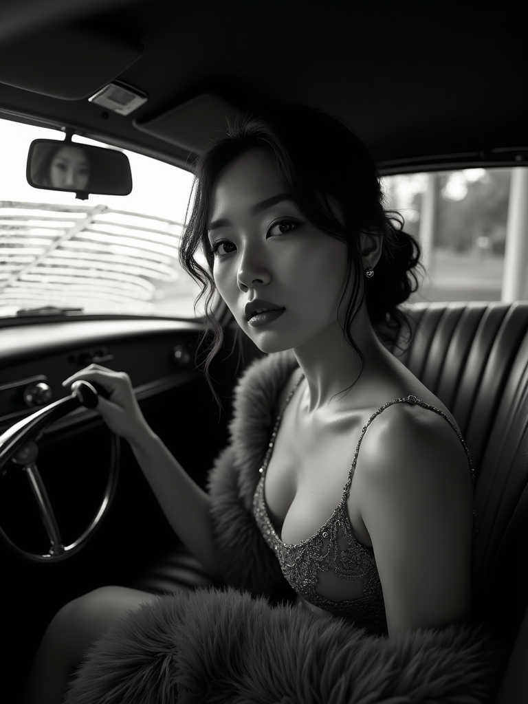 model in a vintage car interior, wearing a fur stole over an evening dress , dramatic lighting through car windows creating venetian blind effect, rear-view mirror showing mysterious figure, high-contrast black and white photography