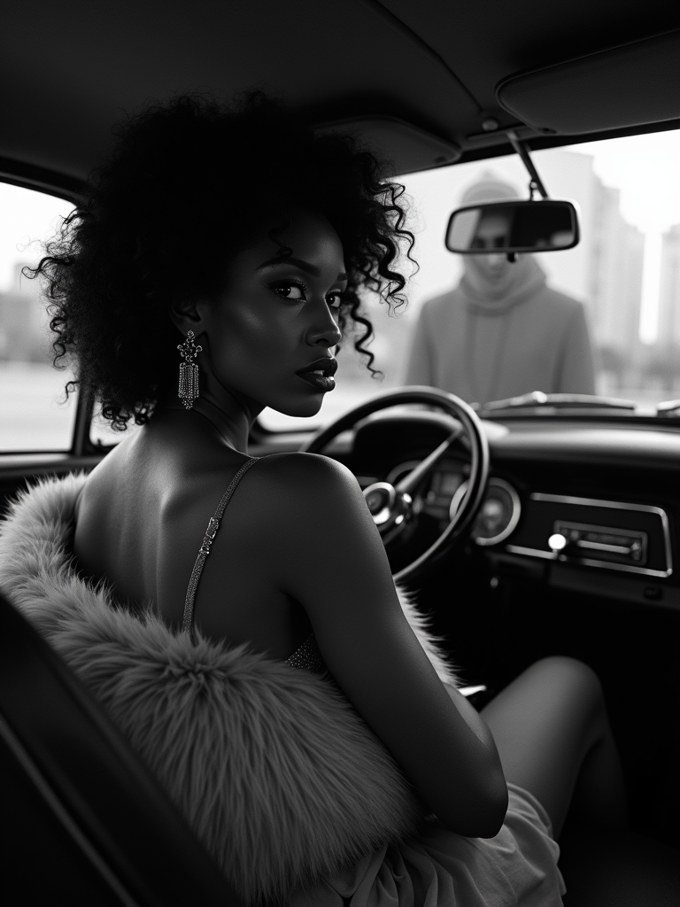 model in a vintage car interior, wearing a fur stole over an evening dress , dramatic lighting through car windows creating venetian blind effect, rear-view mirror showing mysterious figure, high-contrast black and white photography