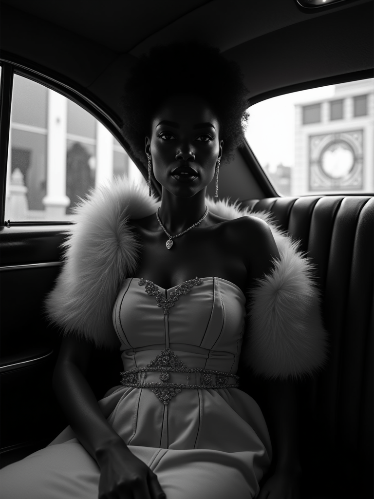model in a vintage car interior, wearing a fur stole over an evening dress , dramatic lighting through car windows creating venetian blind effect, rear-view mirror showing mysterious figure, high-contrast black and white photography