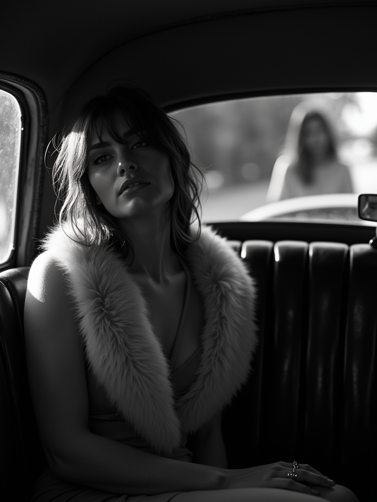 model in a vintage car interior, wearing a fur stole over an evening dress , dramatic lighting through car windows creating venetian blind effect, rear-view mirror showing mysterious figure, high-contrast black and white photography