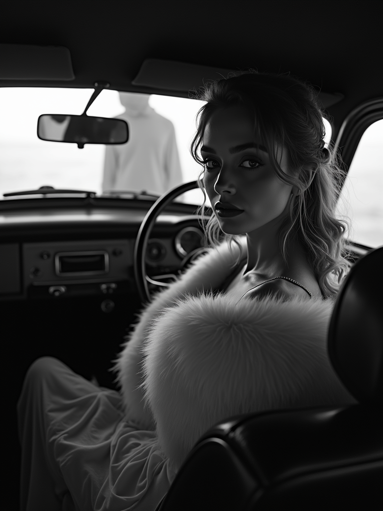 model in a vintage car interior, wearing a fur stole over an evening dress , dramatic lighting through car windows creating venetian blind effect, rear-view mirror showing mysterious figure, high-contrast black and white photography