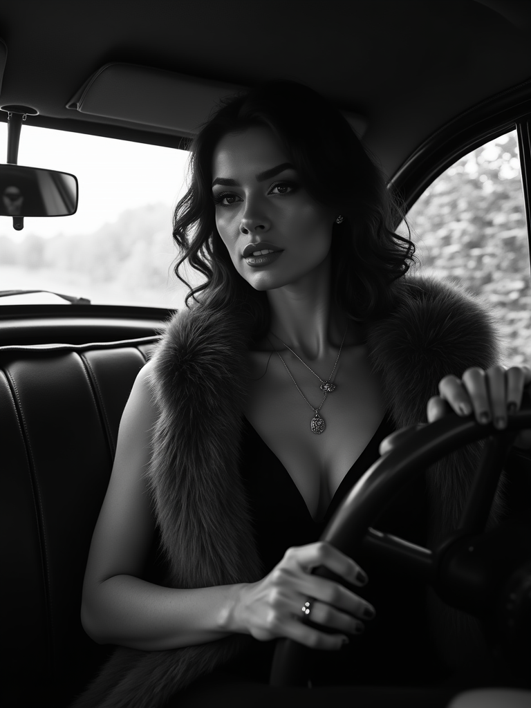 model in a vintage car interior, wearing a fur stole over an evening dress , dramatic lighting through car windows creating venetian blind effect, rear-view mirror showing mysterious figure, high-contrast black and white photography