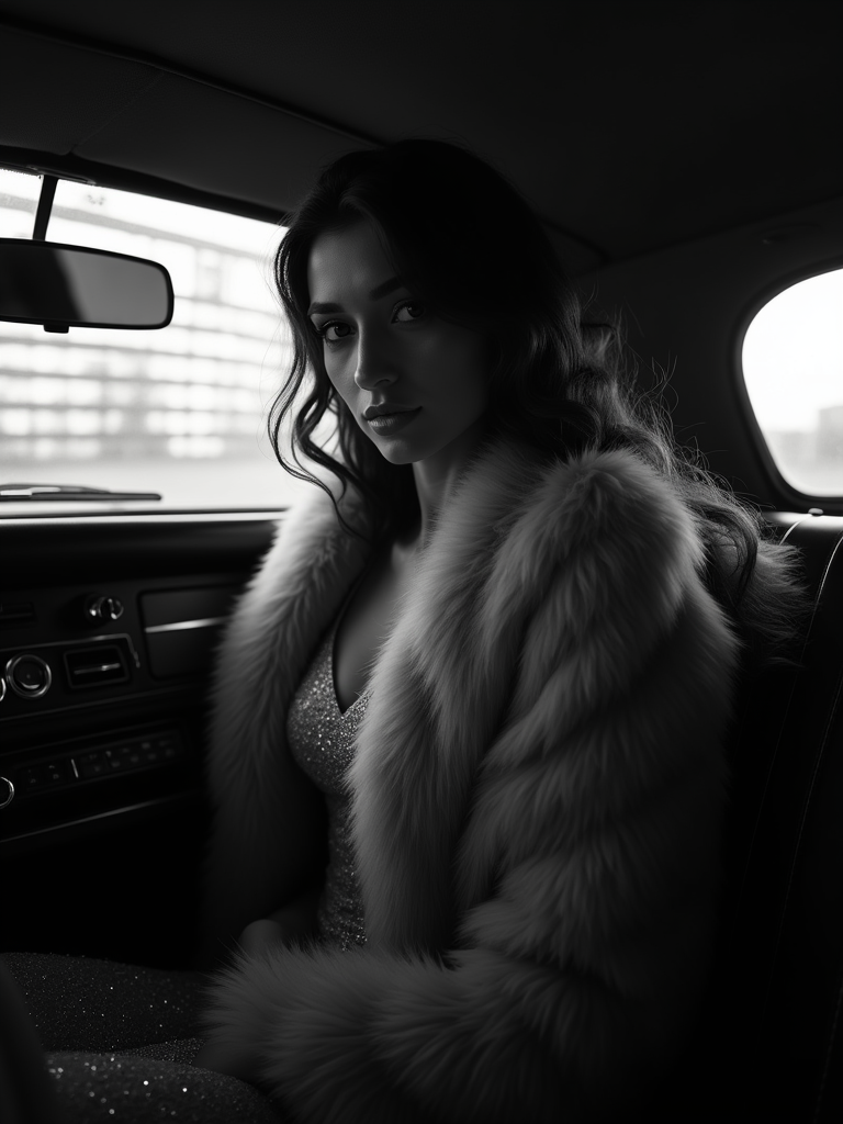 model in a vintage car interior, wearing a fur stole over an evening dress , dramatic lighting through car windows creating venetian blind effect, rear-view mirror showing mysterious figure, high-contrast black and white photography