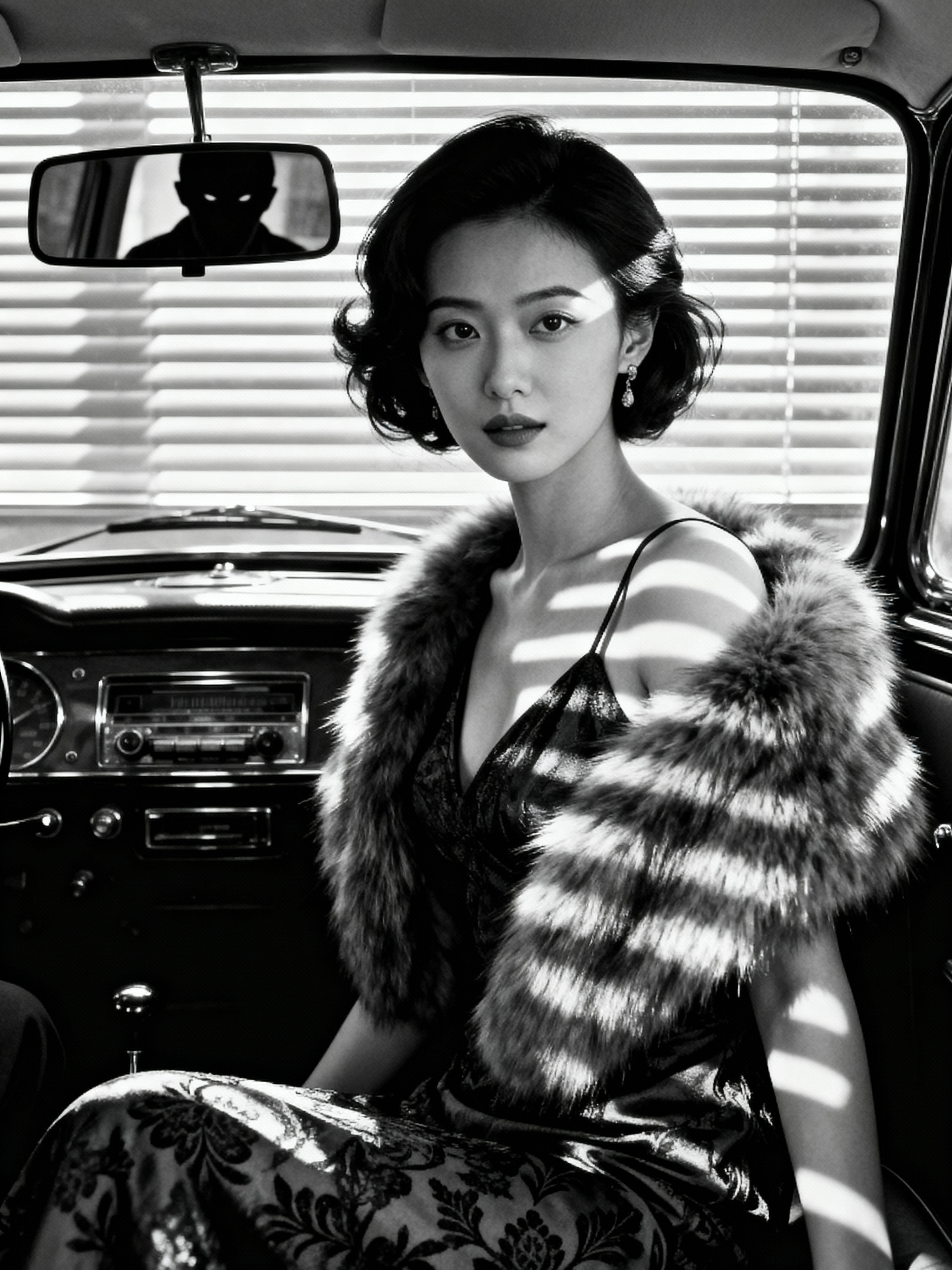 model in a vintage car interior, wearing a fur stole over an evening dress , dramatic lighting through car windows creating venetian blind effect, rear-view mirror showing mysterious figure, high-contrast black and white photography