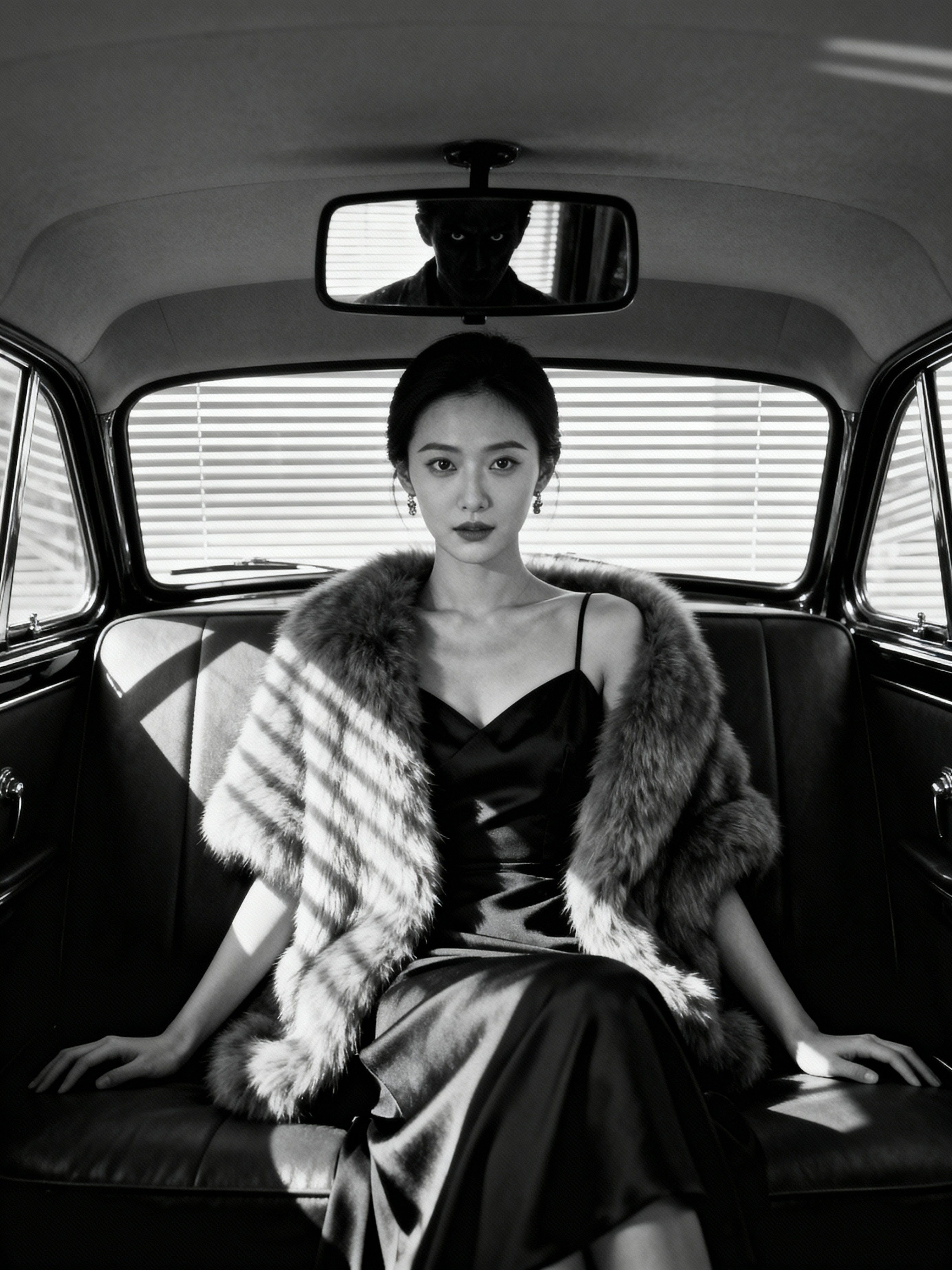 model in a vintage car interior, wearing a fur stole over an evening dress , dramatic lighting through car windows creating venetian blind effect, rear-view mirror showing mysterious figure, high-contrast black and white photography