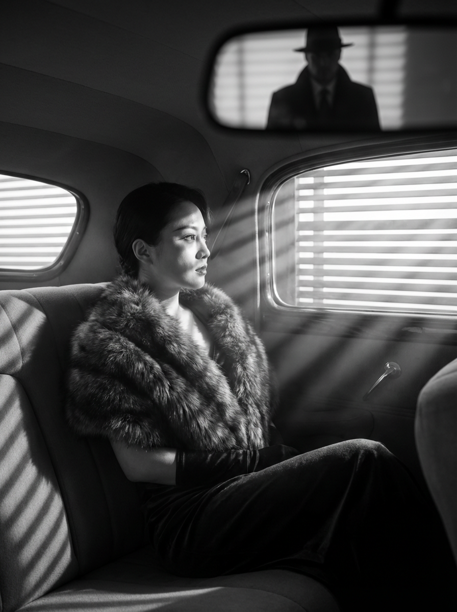 model in a vintage car interior, wearing a fur stole over an evening dress , dramatic lighting through car windows creating venetian blind effect, rear-view mirror showing mysterious figure, high-contrast black and white photography