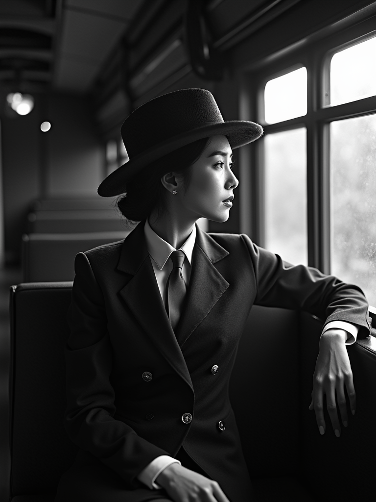 model in a vintage train compartment, wearing an elegant traveling suit with hat , looking pensively out the window, dramatic shadows from passing lights, mysterious atmosphere, high-contrast black and white photography