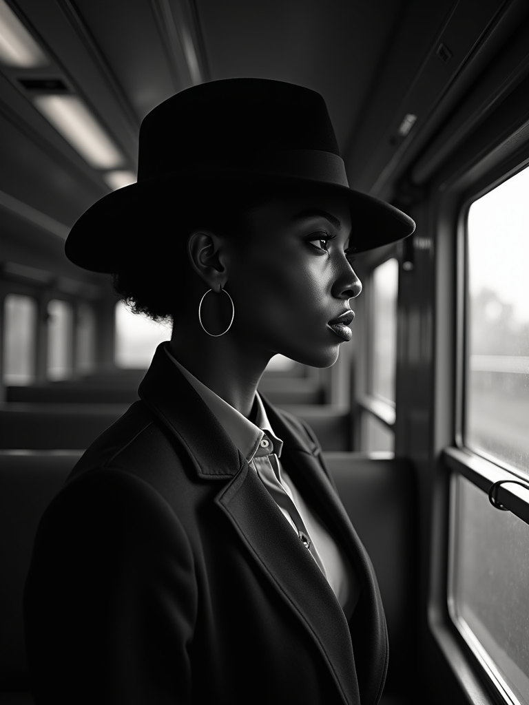 model in a vintage train compartment, wearing an elegant traveling suit with hat , looking pensively out the window, dramatic shadows from passing lights, mysterious atmosphere, high-contrast black and white photography