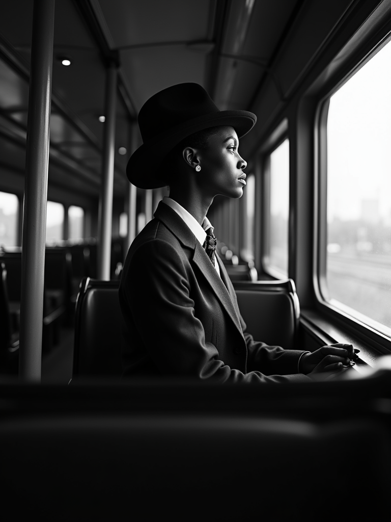 model in a vintage train compartment, wearing an elegant traveling suit with hat , looking pensively out the window, dramatic shadows from passing lights, mysterious atmosphere, high-contrast black and white photography