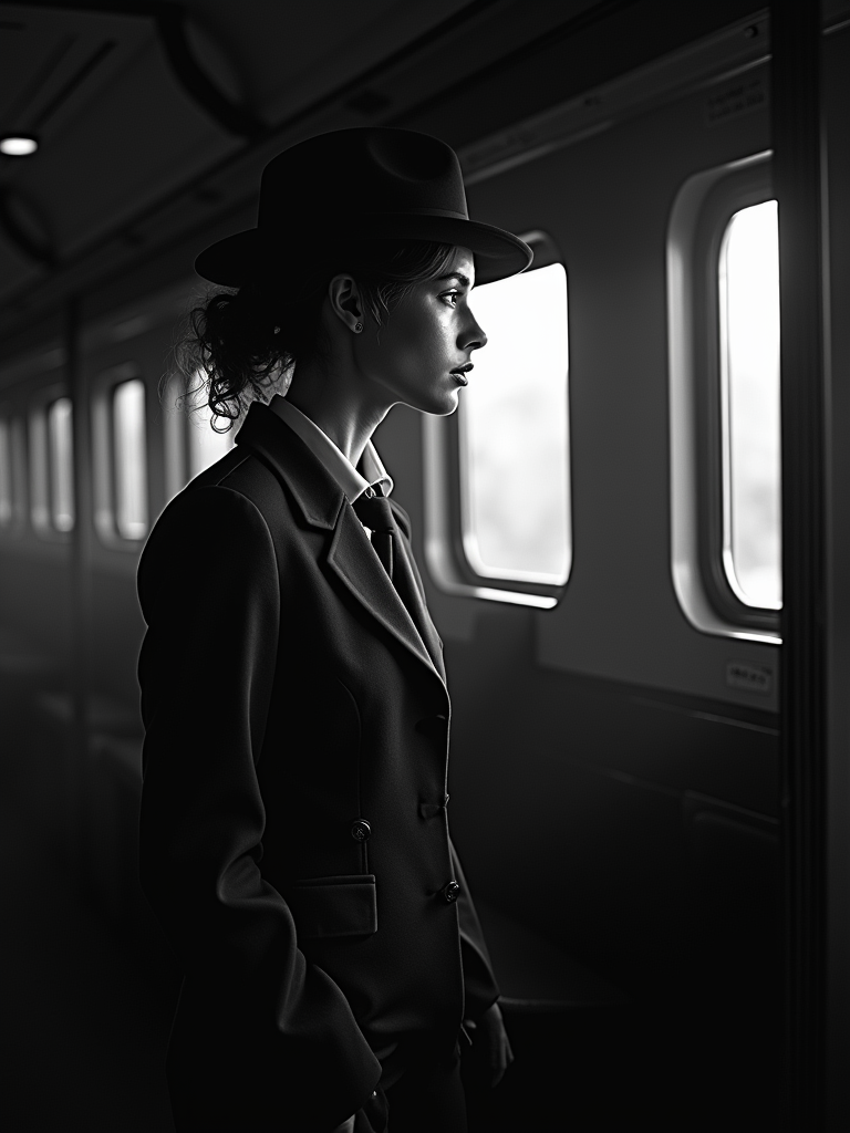 model in a vintage train compartment, wearing an elegant traveling suit with hat , looking pensively out the window, dramatic shadows from passing lights, mysterious atmosphere, high-contrast black and white photography