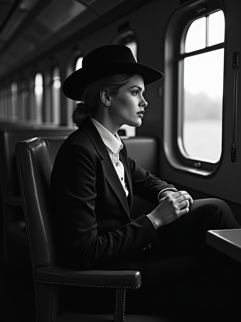 model in a vintage train compartment, wearing an elegant traveling suit with hat , looking pensively out the window, dramatic shadows from passing lights, mysterious atmosphere, high-contrast black and white photography
