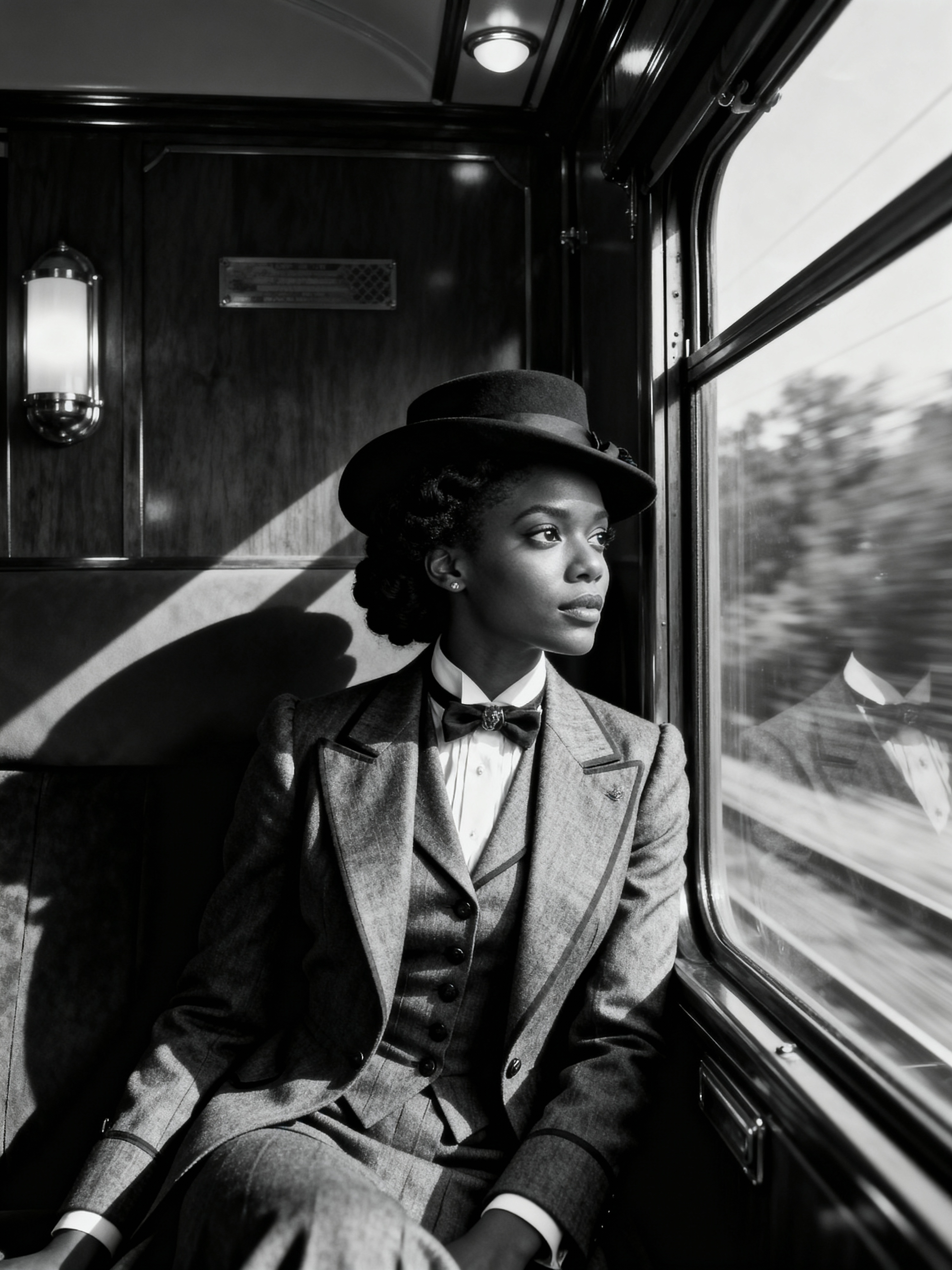 model in a vintage train compartment, wearing an elegant traveling suit with hat , looking pensively out the window, dramatic shadows from passing lights, mysterious atmosphere, high-contrast black and white photography