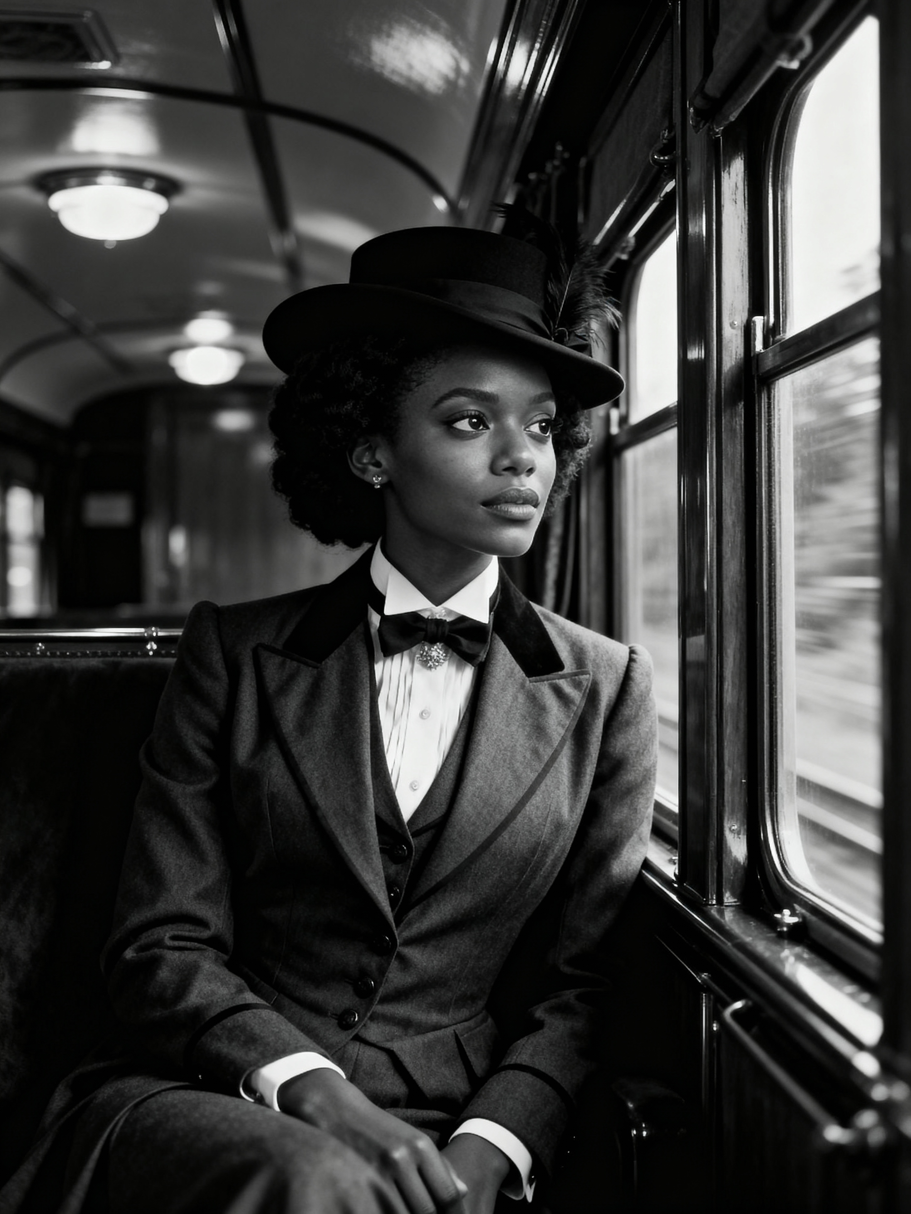 model in a vintage train compartment, wearing an elegant traveling suit with hat , looking pensively out the window, dramatic shadows from passing lights, mysterious atmosphere, high-contrast black and white photography