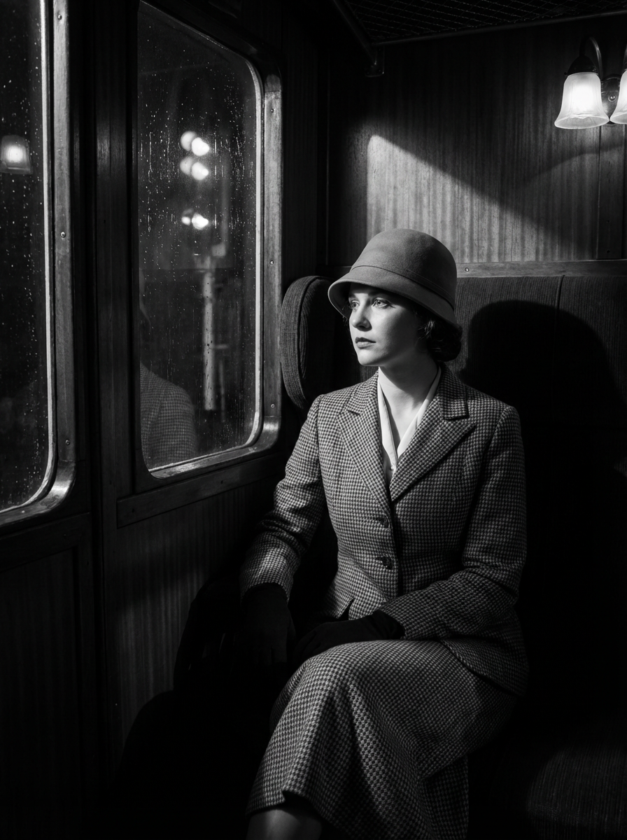 model in a vintage train compartment, wearing an elegant traveling suit with hat , looking pensively out the window, dramatic shadows from passing lights, mysterious atmosphere, high-contrast black and white photography