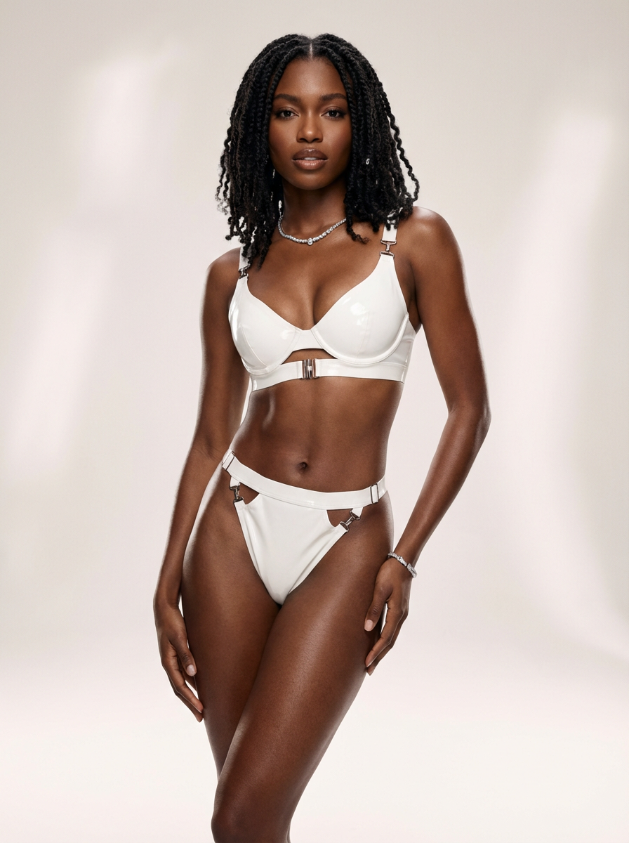 model in a white pvc latex lingerie posing for a picture, bella thorne, wearing a white lingerie, white lingerie, bulgari, suki, bvlgari jewelry, metal lingerie, model body, bella, white silver lingerie, bella ragazza, gq magazine, beautiful fashion model body, pvc latex lingerie model, in lingerie, by Jerry Weiss, shiny glossy plastic lingerie