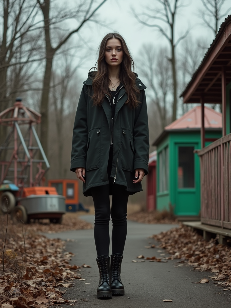 model in abandoned overgrown amusement park with amusement rides in Chernobyl. wearing black boots and black pants.