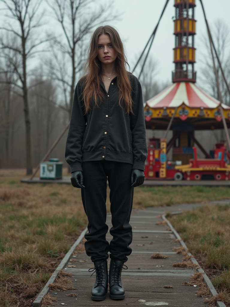 model in abandoned overgrown amusement park with amusement rides in Chernobyl. wearing black boots and black pants.