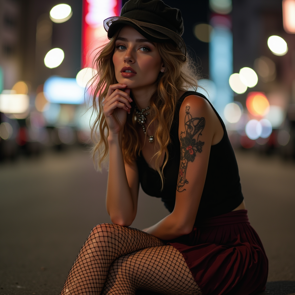 model in an e-girl streetwear fashion shoot. fishnet stockings, pleated skirt, chunky boots . urban background, city lights.