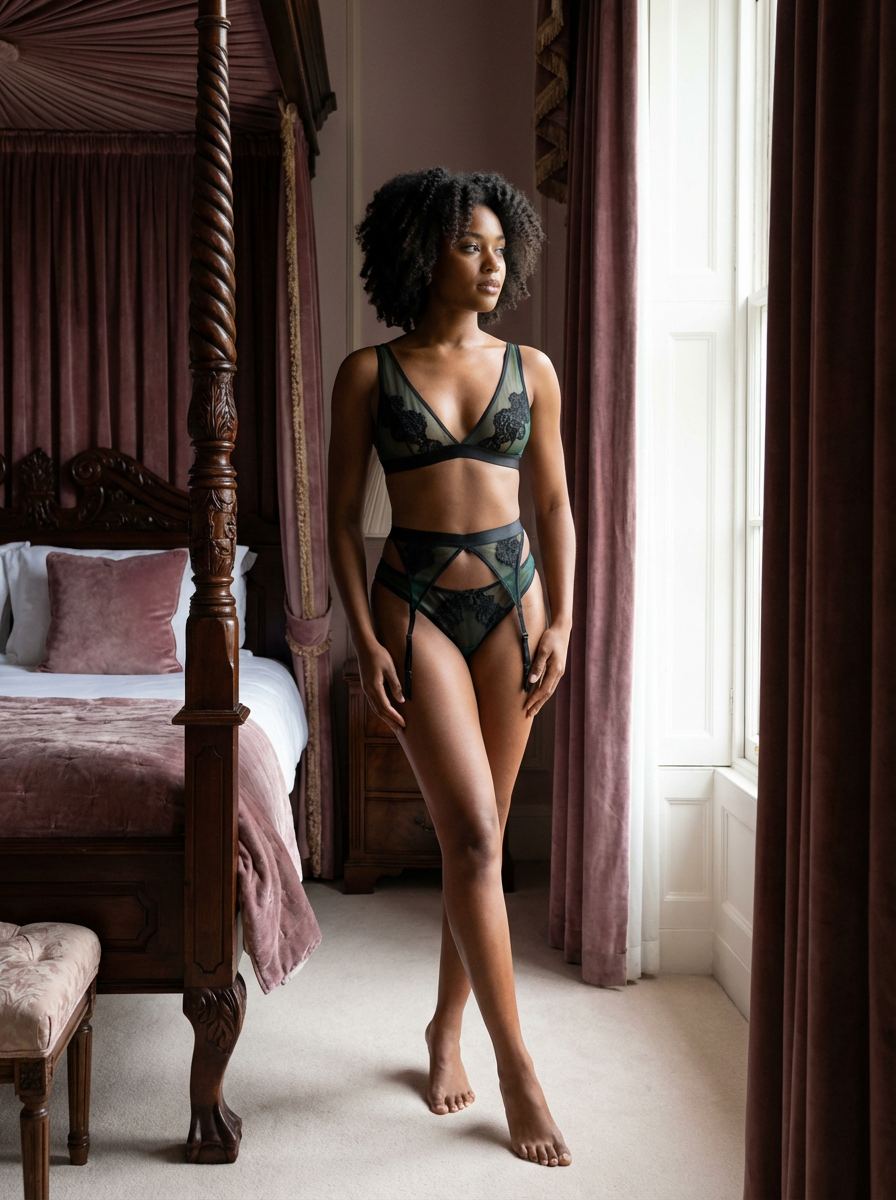 model in an elegant multi-piece designer lingerie set with sheer tulle panels, hand-appliqued lace motifs, and silk satin binding. the sophisticated design features subtle cutouts and architectural seaming. luxury bedroom setting