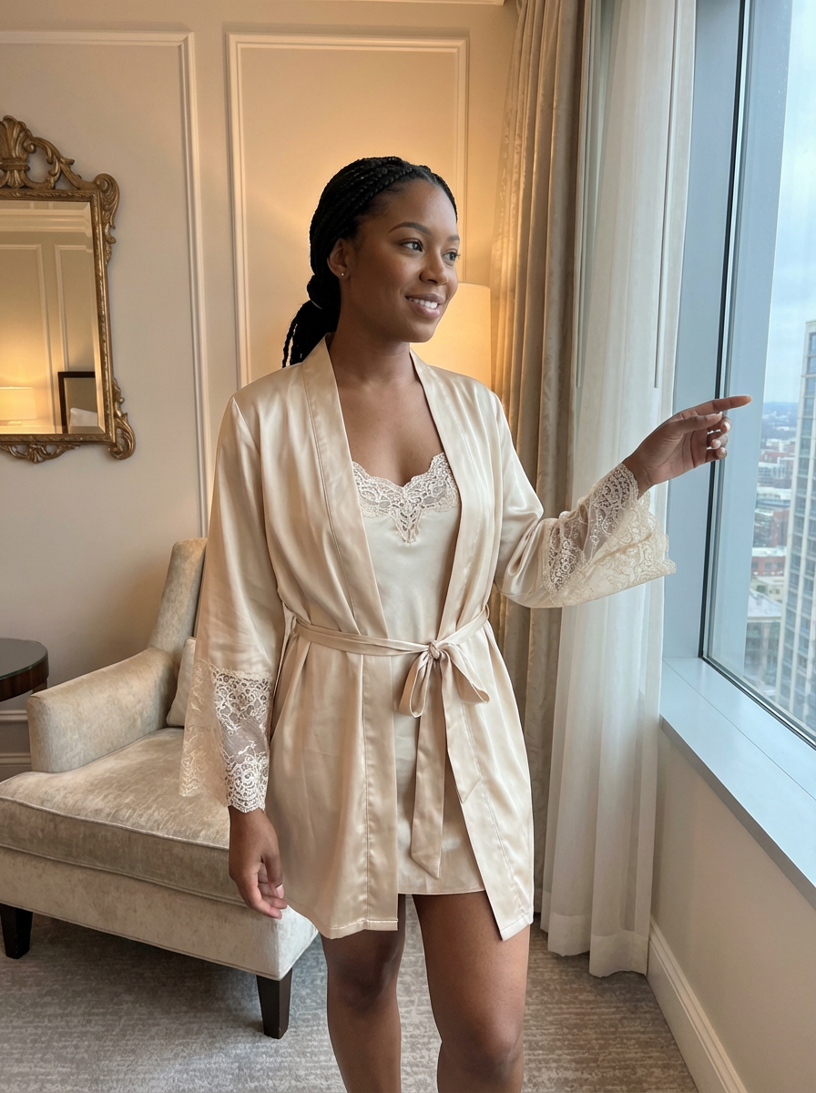 model in an elegant robe and chemise set made from pure silk with French lace insets. the flowing silhouette and delicate details create a timeless, sophisticated look. luxury hotel suite setting