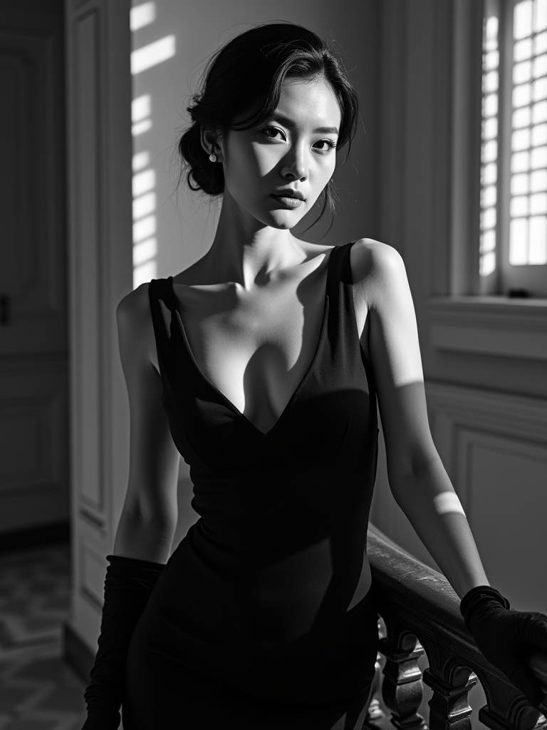 model in an elegant vintage hotel lobby, wearing a sophisticated cocktail dress with gloves , leaning against ornate railing, dramatic venetian blinds casting striped shadows, black and white photography with deep shadows
