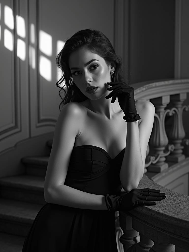 model in an elegant vintage hotel lobby, wearing a sophisticated cocktail dress with gloves , leaning against ornate railing, dramatic venetian blinds casting striped shadows, black and white photography with deep shadows