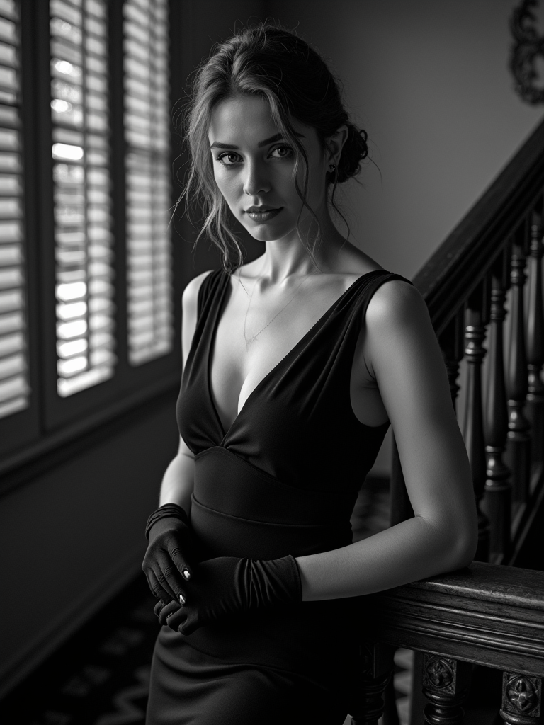 model in an elegant vintage hotel lobby, wearing a sophisticated cocktail dress with gloves , leaning against ornate railing, dramatic venetian blinds casting striped shadows, black and white photography with deep shadows