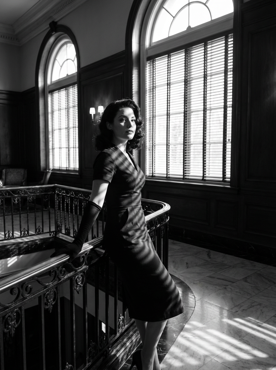 model in an elegant vintage hotel lobby, wearing a sophisticated cocktail dress with gloves , leaning against ornate railing, dramatic venetian blinds casting striped shadows, black and white photography with deep shadows