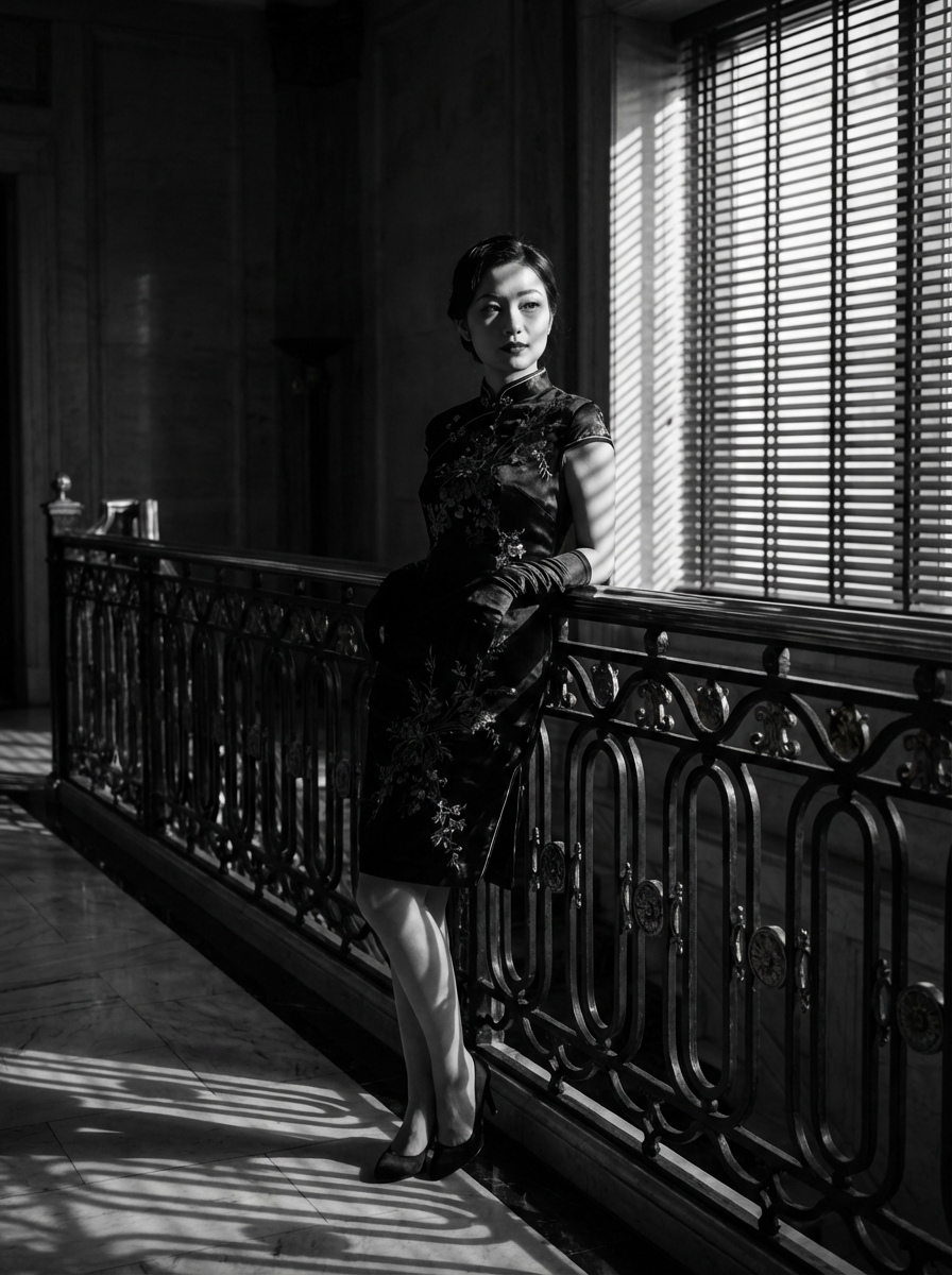 model in an elegant vintage hotel lobby, wearing a sophisticated cocktail dress with gloves , leaning against ornate railing, dramatic venetian blinds casting striped shadows, black and white photography with deep shadows