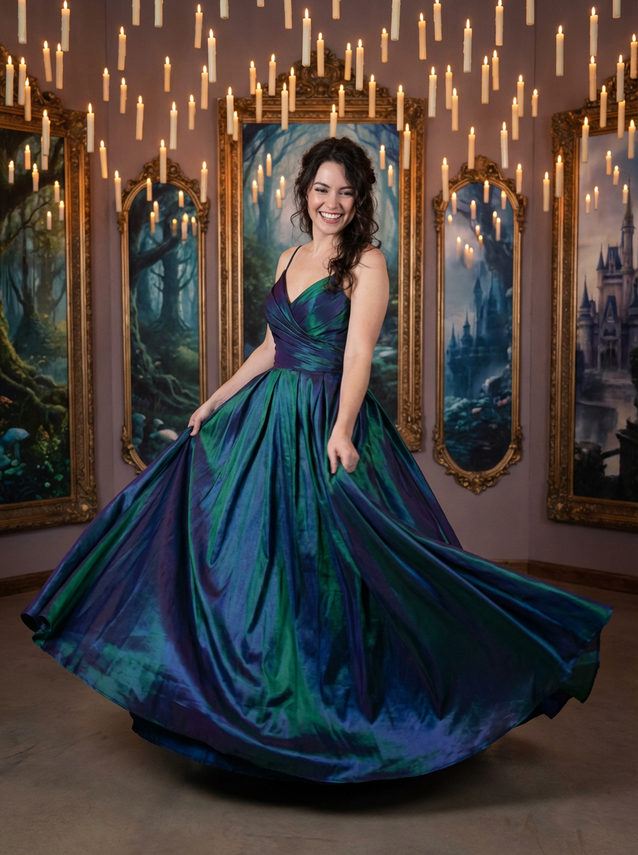 model in an enchanted ballgown that changes colors dancing in a magical ballroom with floating candles and mirror walls that show different fairy realms
