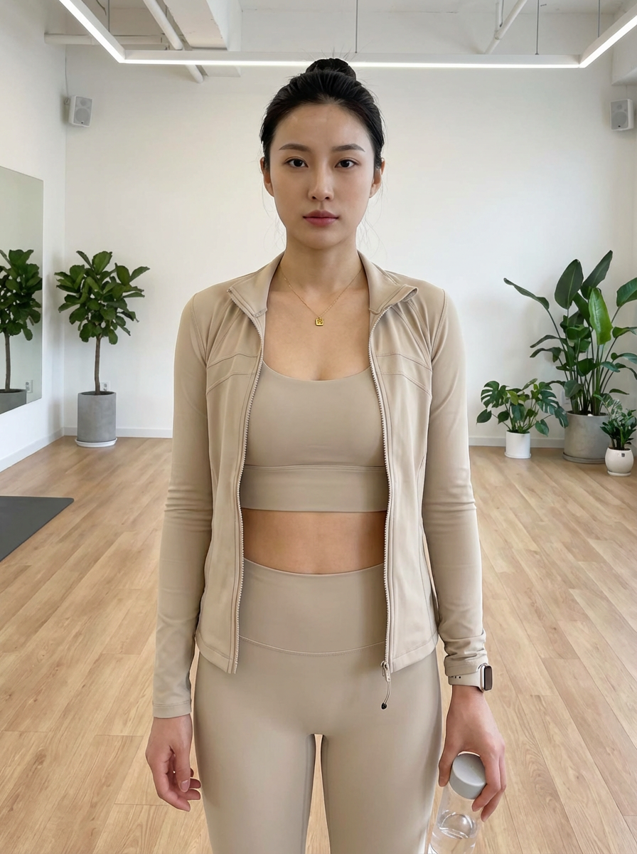 model in athleisure clean girl style, matching set, sleek hair, minimal accessories, gym or studio setting