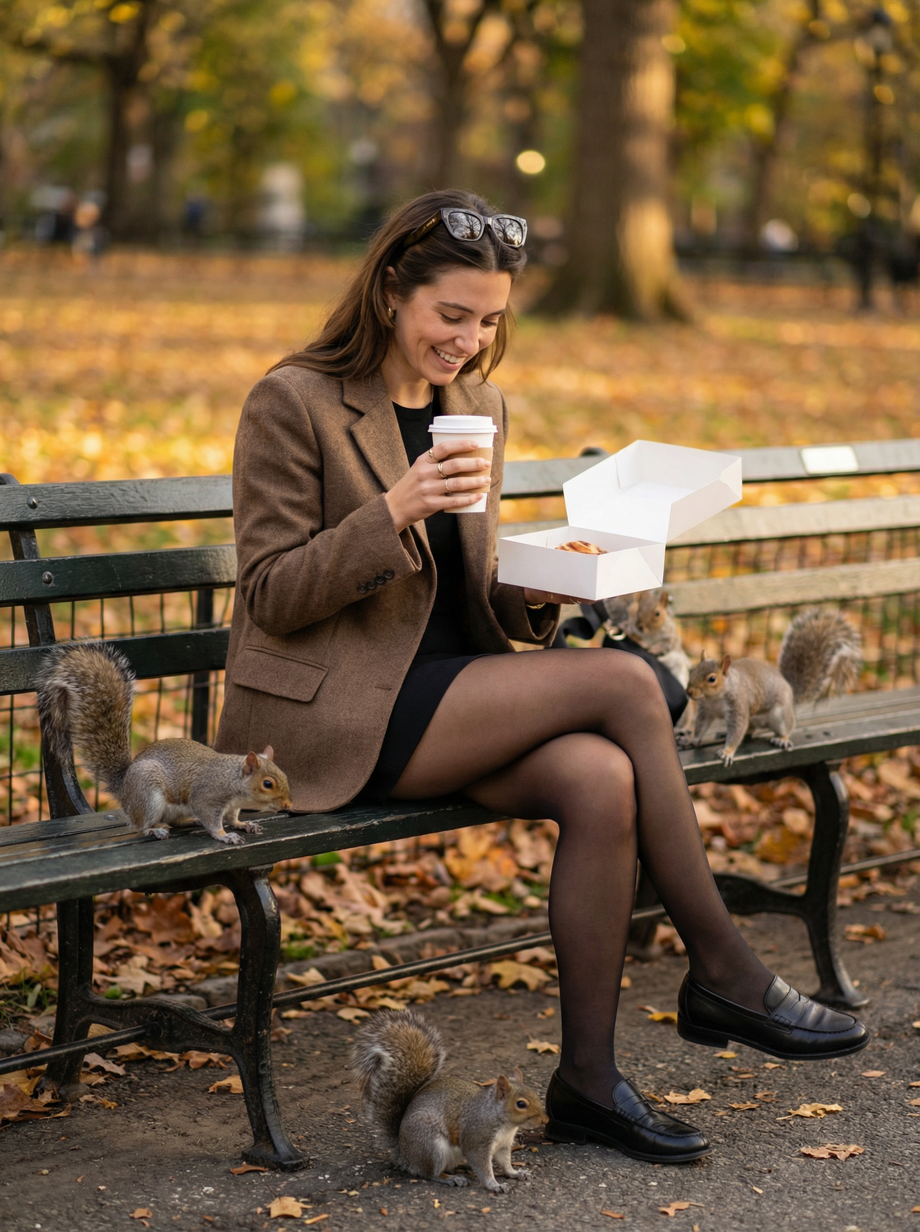 model in autumn city chic: wool blazer, mini skirt, tights, loafers, sunglasses sitting at a stylish park bench with coffee and pastries, 15 squirrels gathering around the model’s feet and climbing the bench, candid street-style shot, warm afternoon light, shallow depth of field