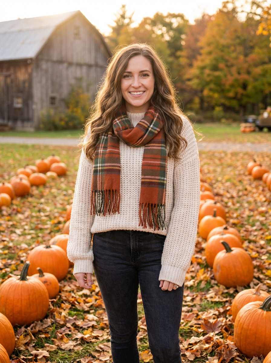 model in autumn leaves, pumpkin patch setting, cozy sweater and scarf, warm fall colors, grateful expression