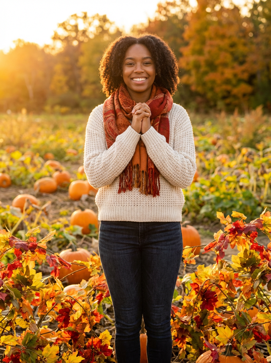 model in autumn leaves, pumpkin patch setting, cozy sweater and scarf, warm fall colors, grateful expression